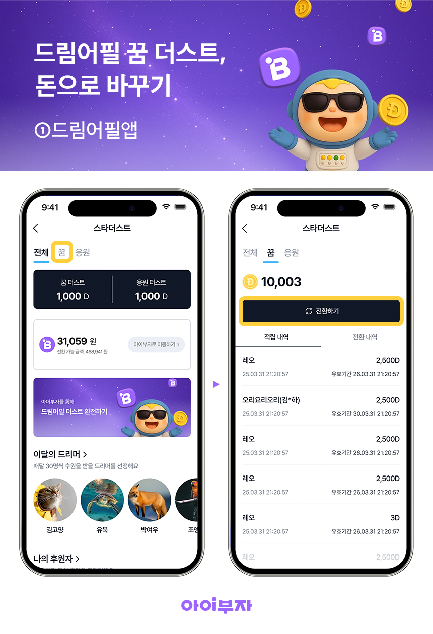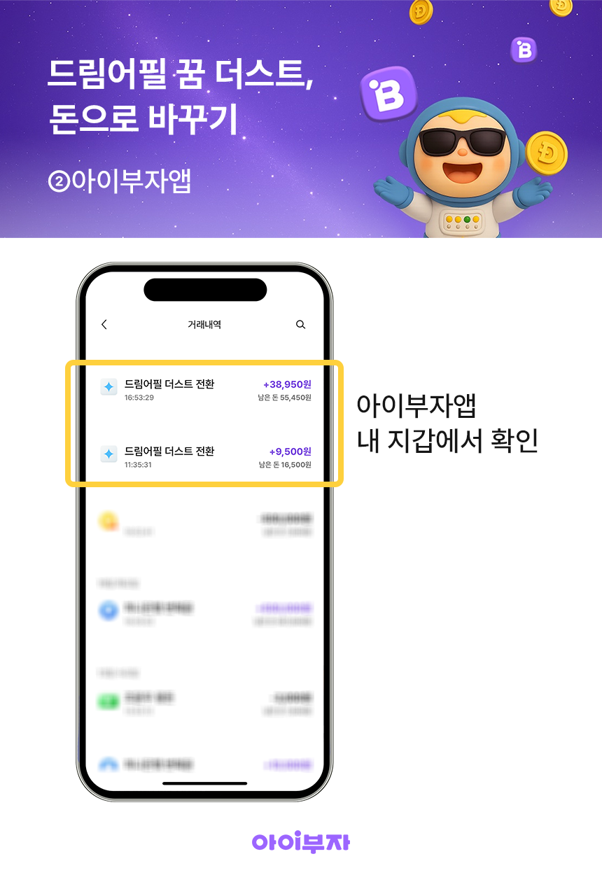 이 중 ✅꿈 더스트는 아이부자에서 돈으로 바꿀 수 있고,