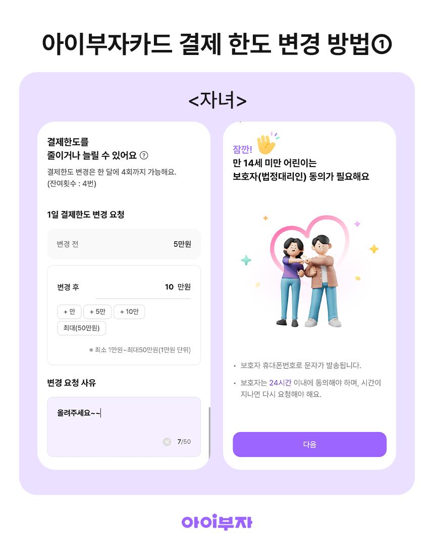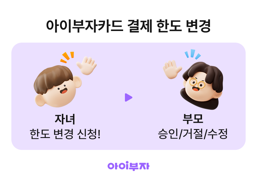아이부자카드 결제 한도는 🧑🏻자녀가 신청하고 👩🏻부모님이 승인을 해주셔야 해요.