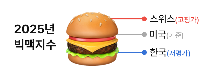 2025년 7월 기준 빅맥지수가 가장 높은 나라는 스위스였고, 우리나라는 중간 수준을 보였답니다.