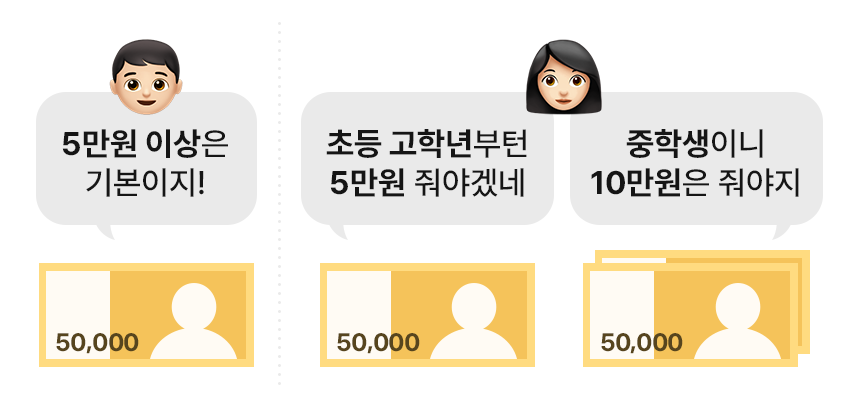 하지만 부모님들은 초등 고학년부터 5만원 이상, 중학생부터 10만원 이상을 생각하고 있었답니다.