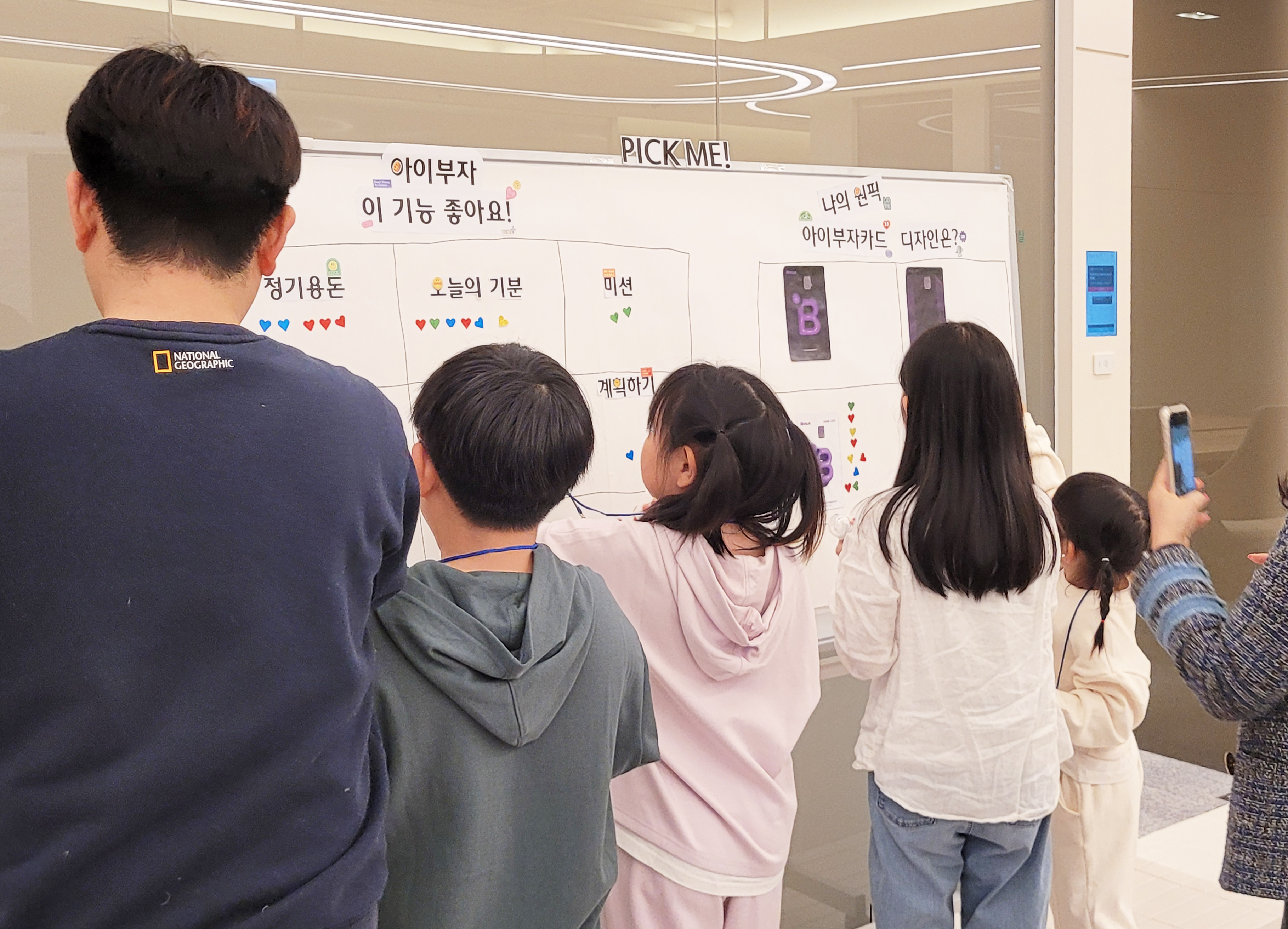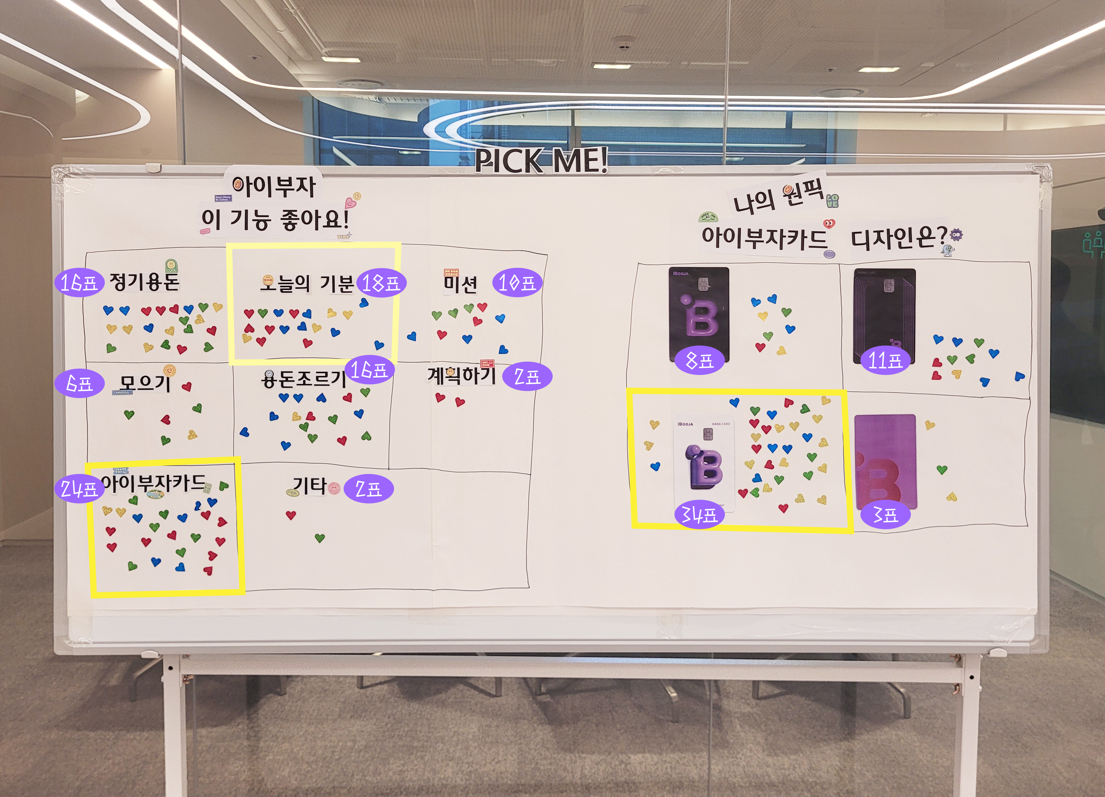 PICK ME 보드에는 두 가지 질문이 적혀 있었는데, ‘✅아이부자 이 기능 좋아요!'에서는 아이부자앱 기능 중 가장 좋아하는 기능을, ‘✅나의 원픽 아이부자카드 디자인은?’에서는 새롭게 출시되는 아이부자카드 중 가장 마음에 드는 디자인을 투표할 수 있었답니다.