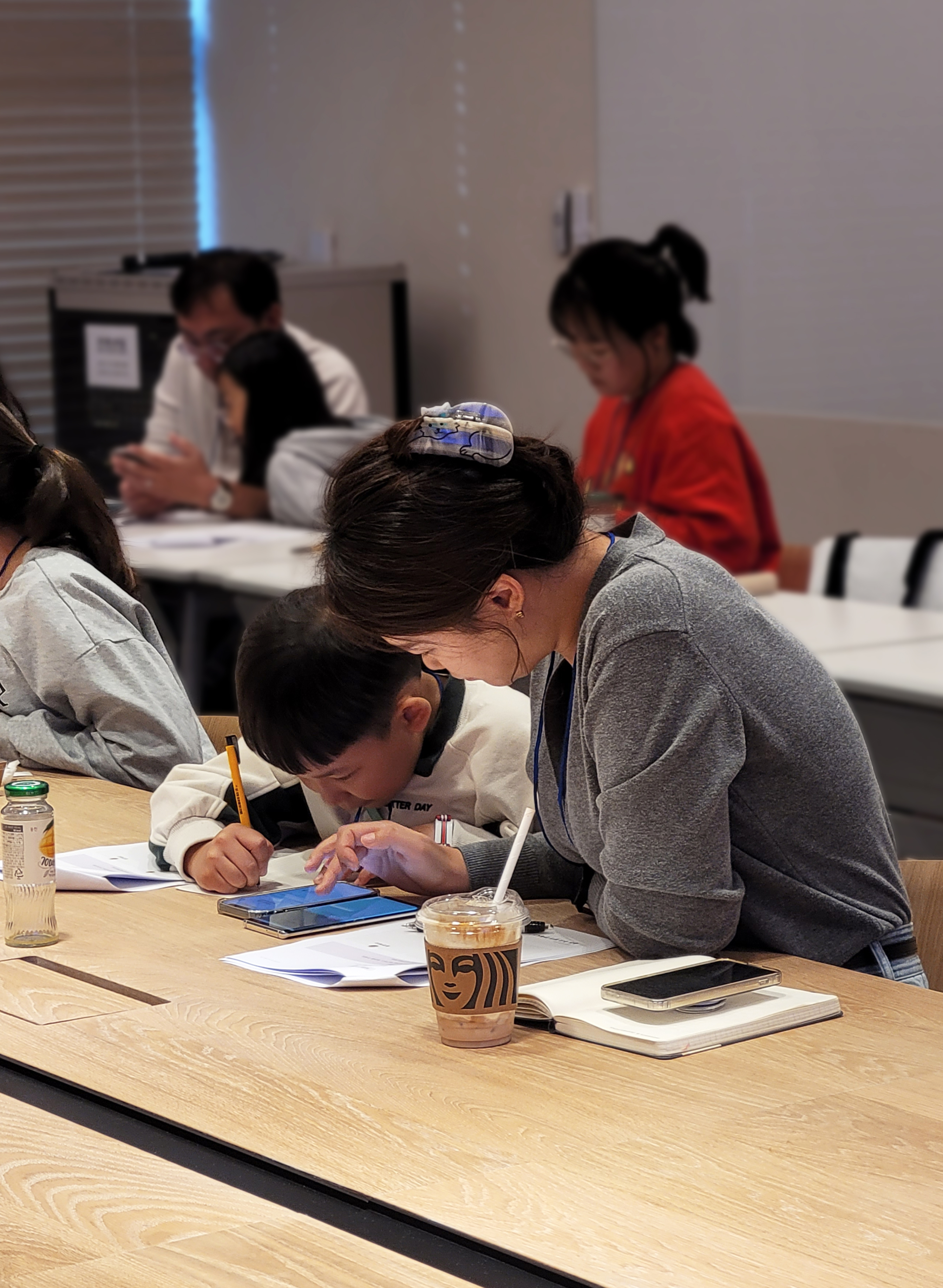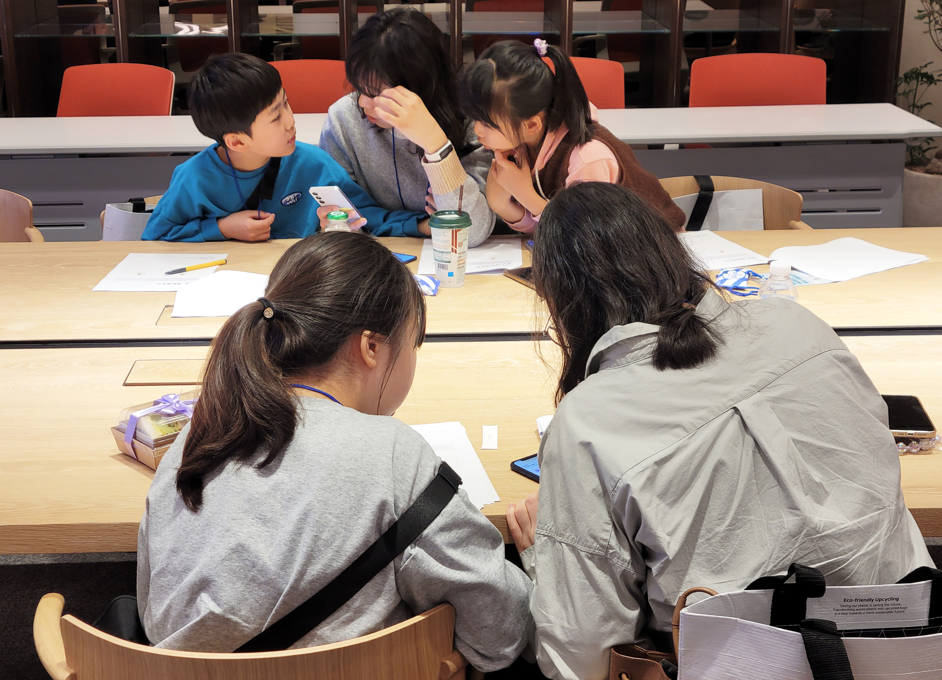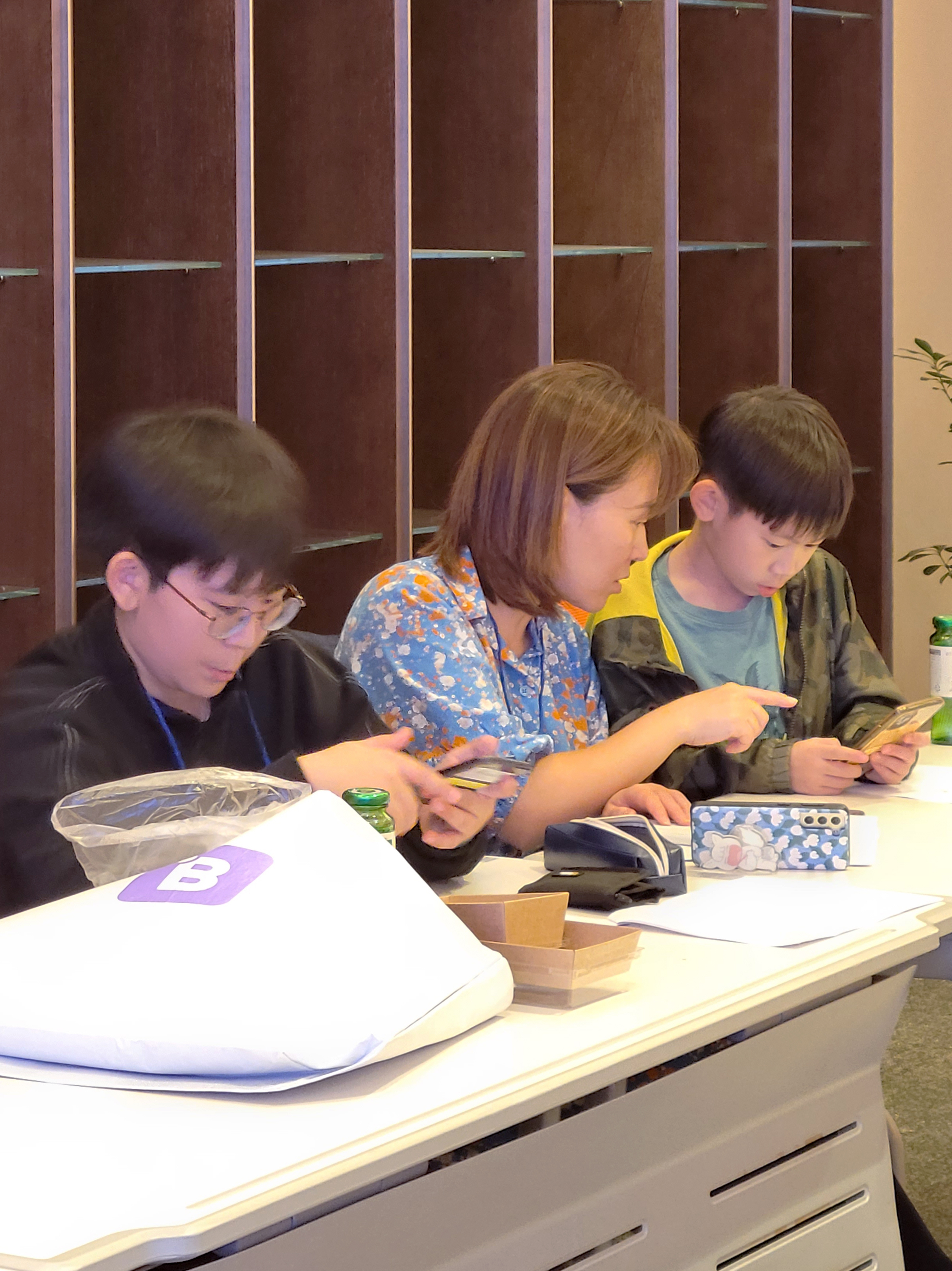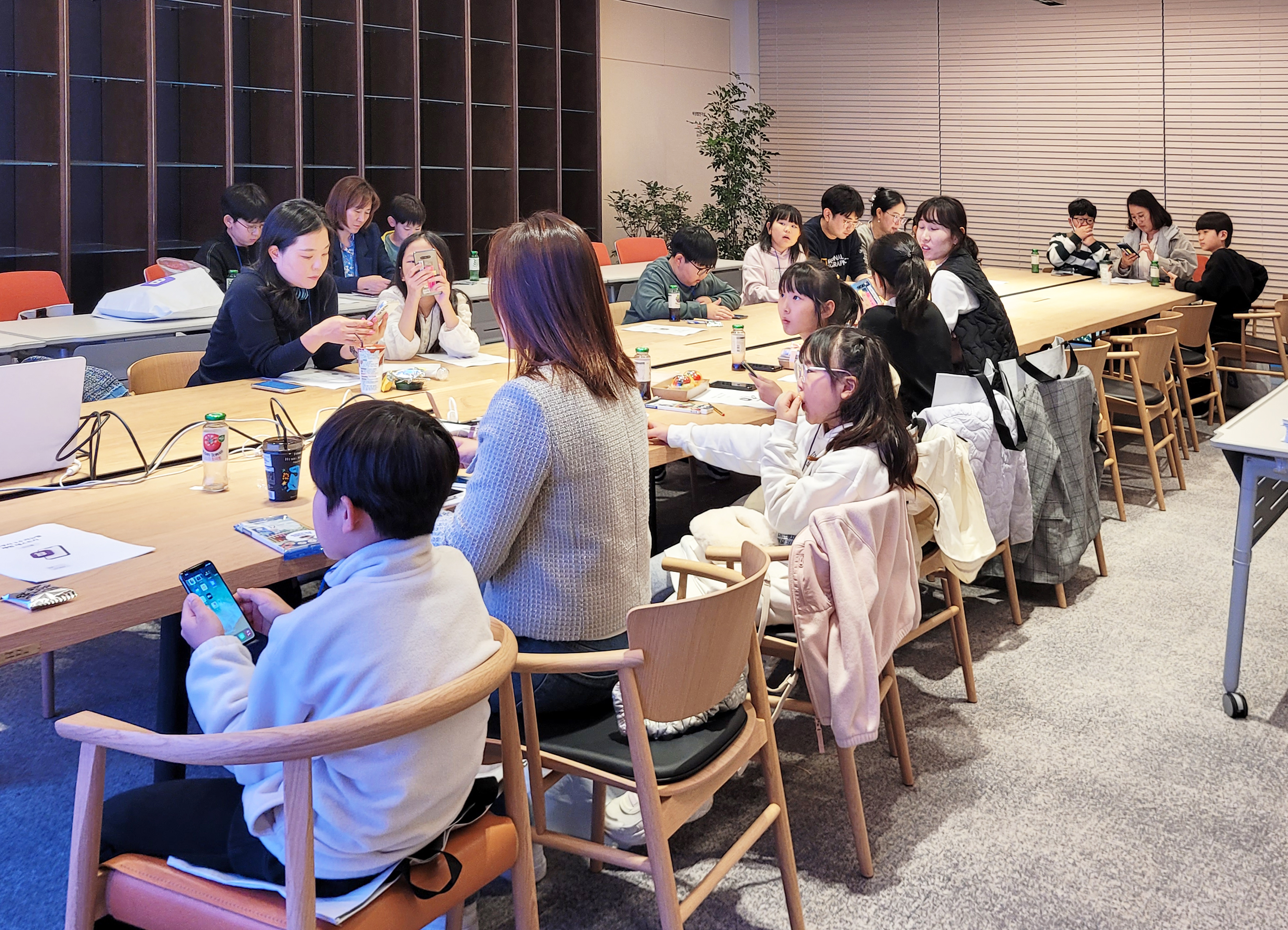 설명이 끝난 후 아이부자 리뉴얼앱이 설치되어 있는 휴대폰과 설문지가 1인당 하나씩 주어졌고, 부모님과 아이는 지급받은 휴대폰으로 각자의 과제를 수행하며 본격적인 체험이 이어졌어요.