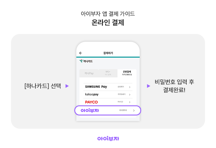 일반결제 : 카드 → 하나카드 → 간편결제 : 아이부자 → (최초 1회 동의 - [카드 사용하기] 버튼 클릭) → [결제] → 아이부자 결제 비밀번호 6자리 → 완료