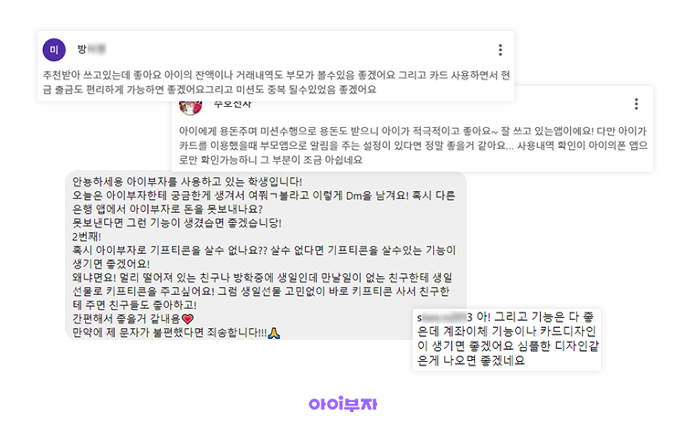😃CLOVA(서비스기획) | 쉽고 간단해 보이는 아이부자의 뒤에는 매우 정교하고 복잡한 고민들이 있어요. 청소년 용돈 서비스 시장의 선도주자인 만큼 오랜 기간 누적된 사용데이터 분석을 통해 실질적으로 사용자들이 필요로 하는 기능을 중심으로 업그레이드했죠. 많이 사용해 주시고 앞으로도 사용자 니즈에 맞춰 진화를 계속하는 아이부자가 되겠습니다!!