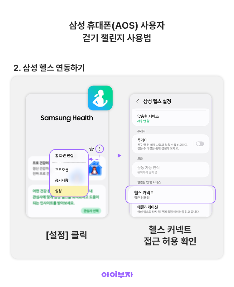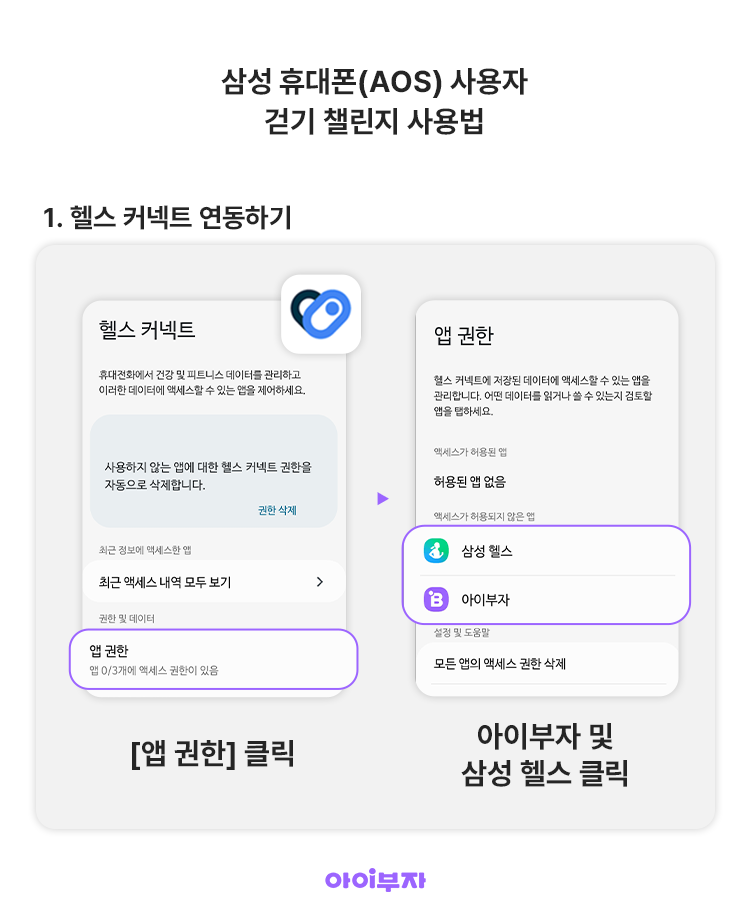 상단 점 세 개 버튼 → 설정 → 연결된 앱 및 서비스 : 헬스 커넥트(접근 허용되어 있는지 확인) → 앱 권한 → 엑세스가 허용된 앱 : 아이부자와 삼성 헬스가 있는지 확인