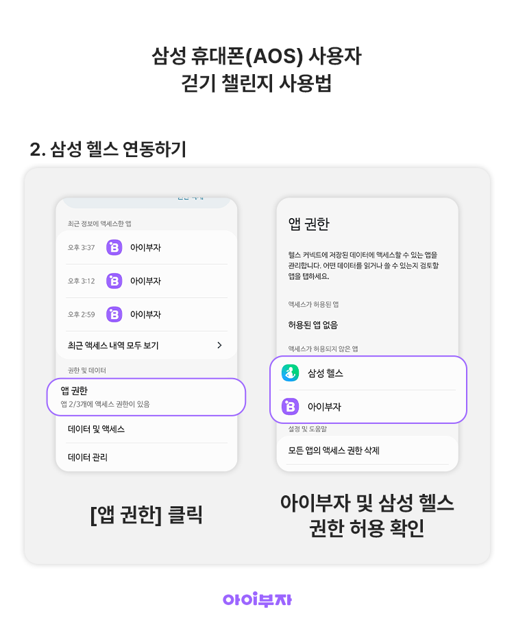 - 앱 권한 → 아이부자 앱 → 모두 및 걸음수 허용
