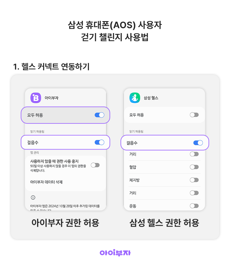 - 앱 권한 → 아이부자 앱 → 모두 및 걸음수 허용