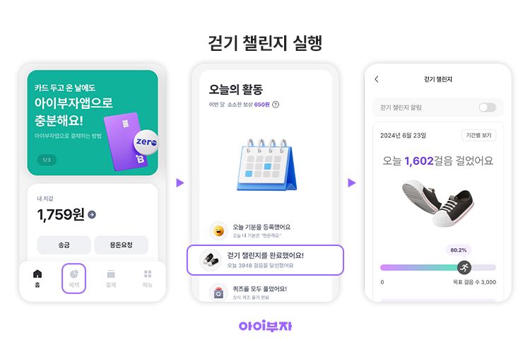 이번 리뉴얼로 새로 추가된 걷기 챌린지는 걷기 습관을 기르며 건강을 챙기고 리워드도 받는 서비스예요. 매일 3천보를 걸으면 보상을 받을 수 있고, 부모님께 걸음수도 공유할 수 있어요.