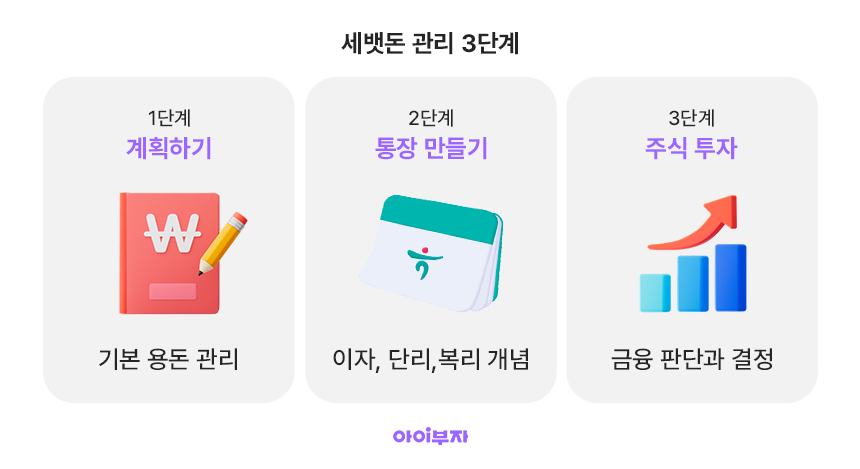 어디에 돈을 모으고, 어떻게 예산을 짜고 점검해야 하는지 등 용돈을 잘 관리할 수 있는 방법과 과정을 알려주면 좋아요.