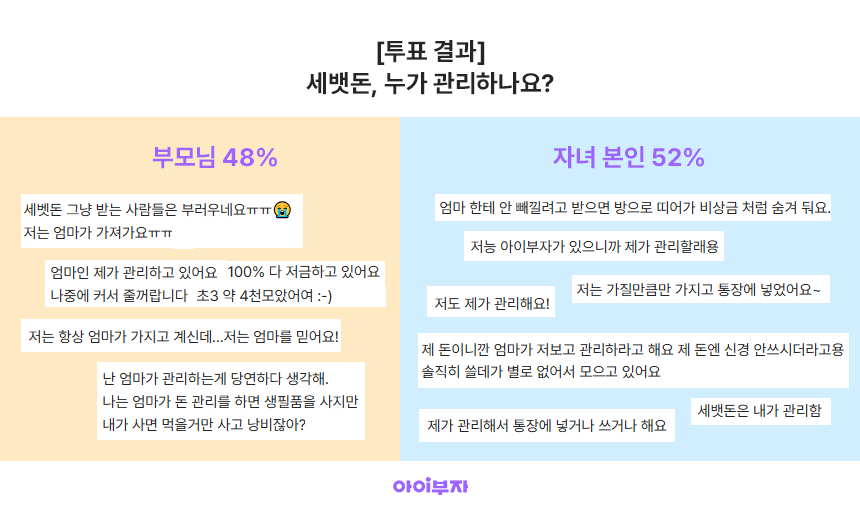투표 결과 자녀 본인이 52%, 부모님이 48%로 세뱃돈을 관리하고 있다고 해요. 자녀 본인이 관리한다는 의견이 조금 더 높았지만, 사실상 막상막하의 대결이었죠!😮