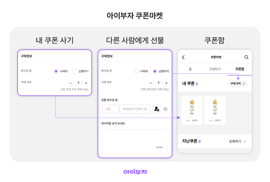 | 🌠구매 및 확인 ① [홈] 또는 [구매하기] 탭 → 원하는 상품 선택 ② 나에게 / 개수 선택 후 결제 ③ [쿠폰함] 내 쿠폰 확인 |
