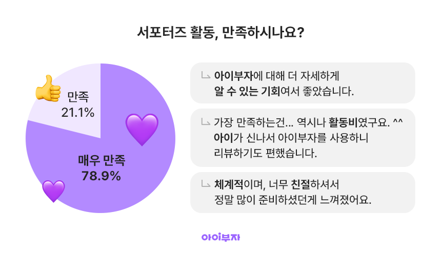 아이부자의 첫 서포터즈 운영이라 미흡한 점이 많았을텐데, 그럼에도 좋은 의견 남겨주시고 적극적으로 참여해주신 모든 서포터즈 멤버분들께 다시 한 번 감사의 인사를 드려요.💜