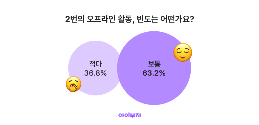 2번의 오프라인 활동 빈도에 대해서는 적당하다는 의견이 63.2%, 적다는 의견이 36.8%였어요.