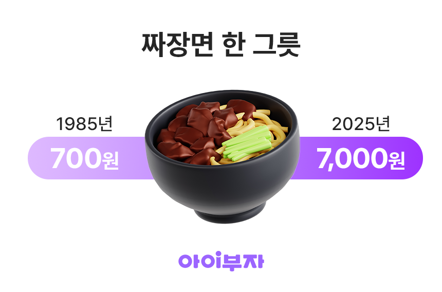 부모님의 어린 시절엔 짜장면 한 그릇이 700, 지금은 7,000원이라고 생각해봐요. 과거에 7,000원이면 짜장면을 10그릇이나 먹을 수 있었을텐데, 지금은 1그릇밖에 먹지 못해요.