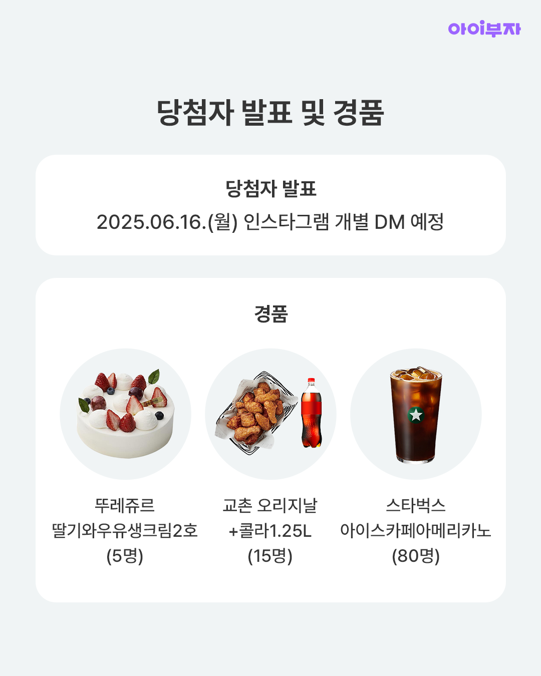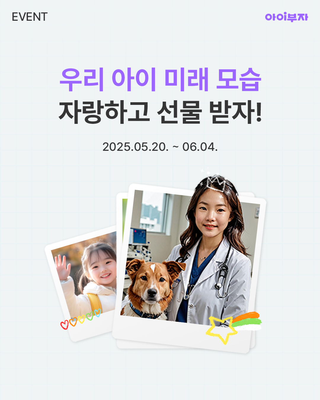 🎉추가 이벤트🎉생성된 이미지를인스타그램 스토리/피드에 올려 자랑하면, 총 100명에게 추가 선물을 드려요! 이벤트 기간 2025.05.20.(화) ~ 2025.06.04.(수) 참여방법 생성된 사진을 인스타그램에 업로드 ↓ 아이부자 인스타그램 계정 팔로우&필수태그 (@i.booja_official #아이부자 #장래희망사진전) 경품(100명) 뚜레쥬르 딸기와우유생크림2호(5명) 교촌 오리지날+콜라1.25L(15명) 스타벅스 아이스카페아메리카노(80명) 당첨 발표 2025.06.16.(월) 인스타그램 개별 DM |