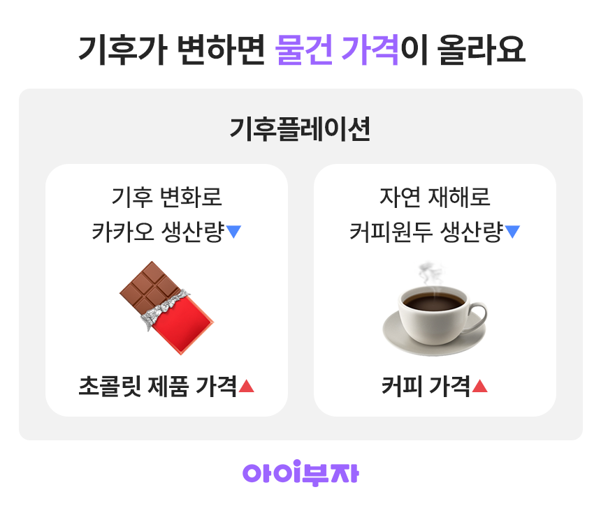 이것을 기후플레이션(기후+인플레이션)이라고 하는데, '기후 변화로 인해 물가(물건의 가치)가 오르는 현상'을 뜻해요.