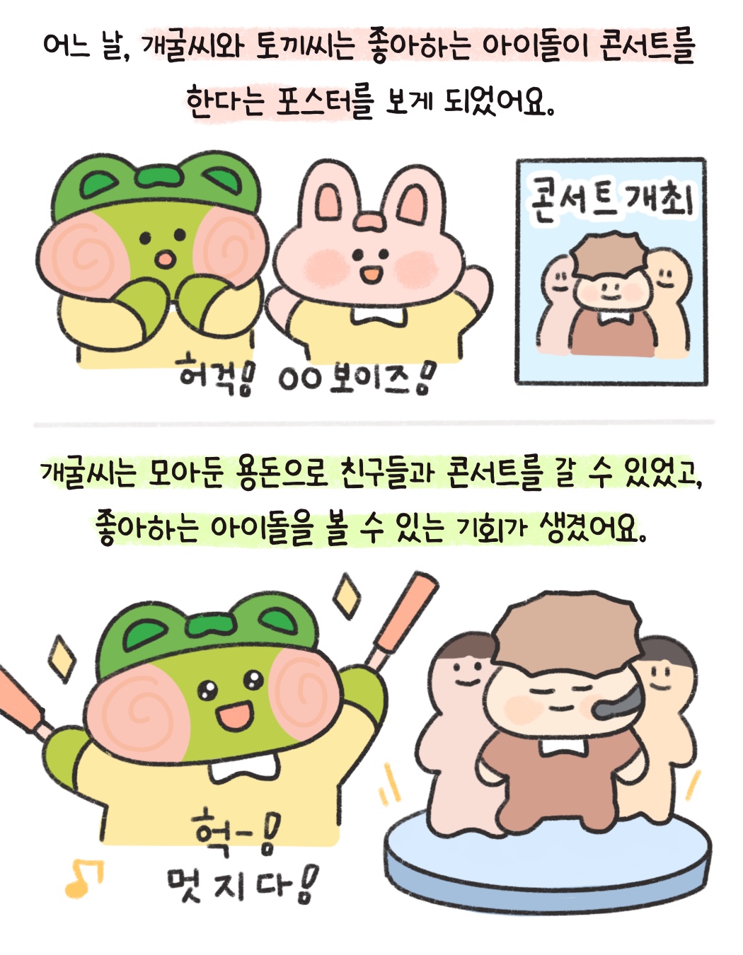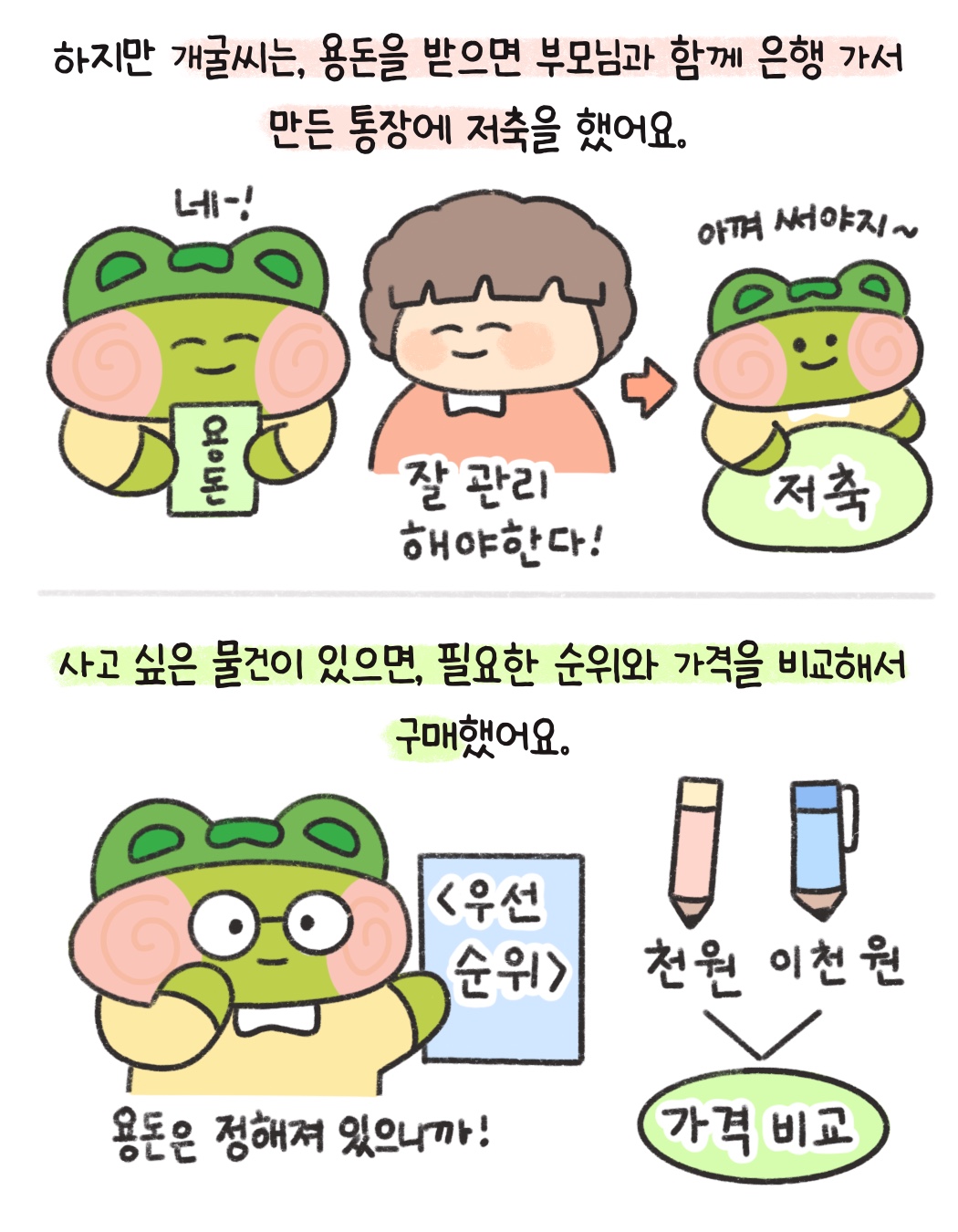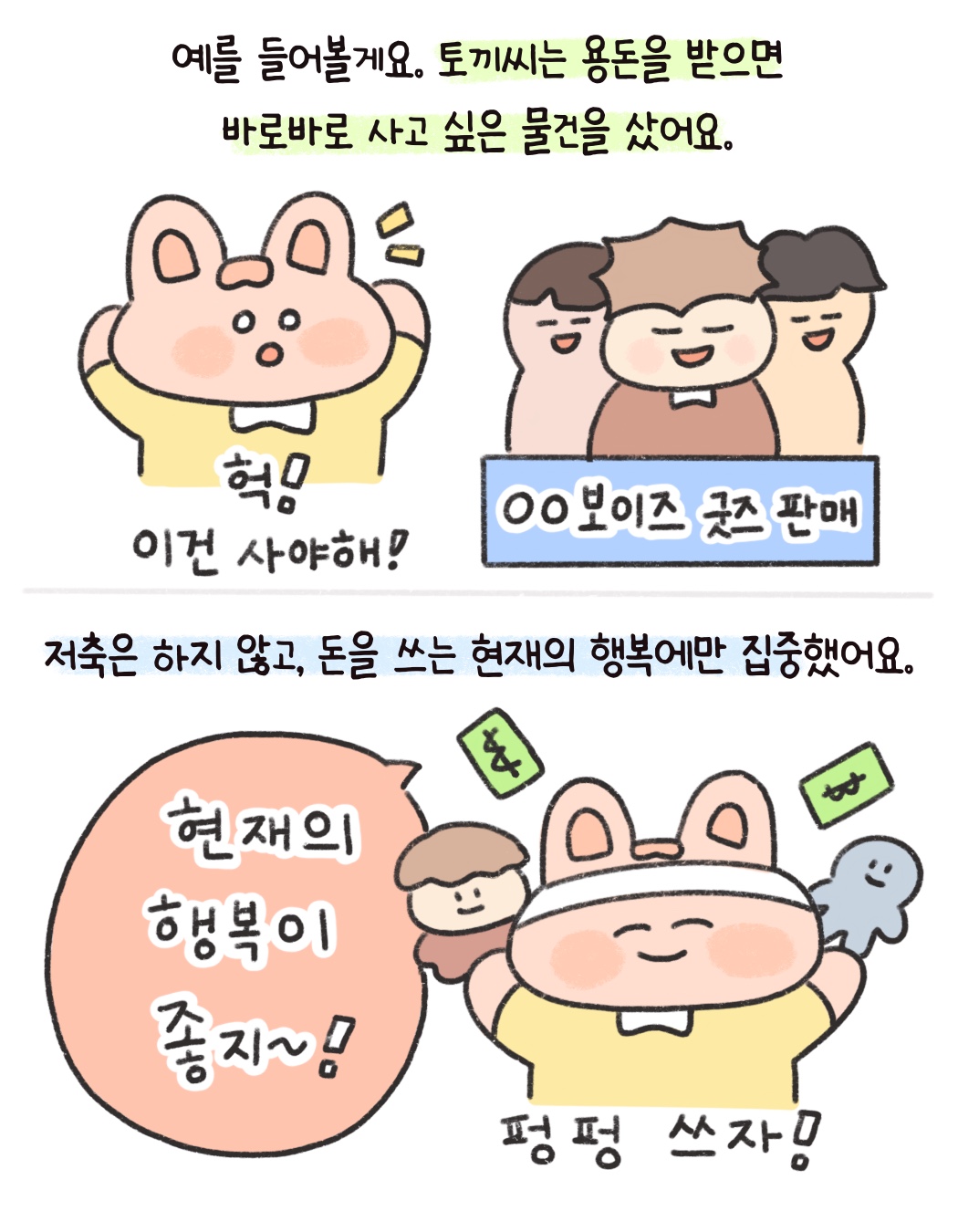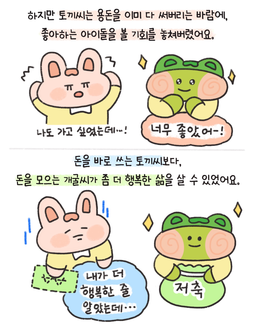 토끼씨처럼 갖고 싶은 물건을 바로바로 사면 당장은 좋을 수 있지만, 꼭 필요한 순간에 돈이 부족할 수도 있어요.