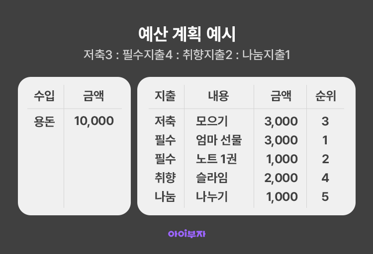 만약 일주일에 용돈을 11만 원 받는다면, ‘저축에 3천 원,꼭 사야 하는 것에 4천 원,사고 싶은 것에 2천 원,기부에 1천 원’으로 계획하는 거예요