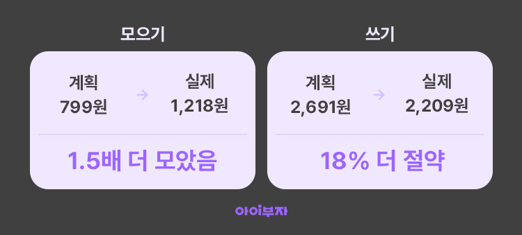 계획은 감정적이고 충동적인 소비를 막아서 돈을 잘 모을 수 있게 도와줘요. 실제로 아이부자에서 계획을 세우고 잘 지킨 친구들은 계획했던 것보다 돈을 더 잘 모으고 아꼈답니다.